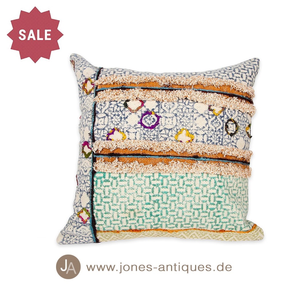 Buntes Kissen in den Farben blau, grün und orange gemustert