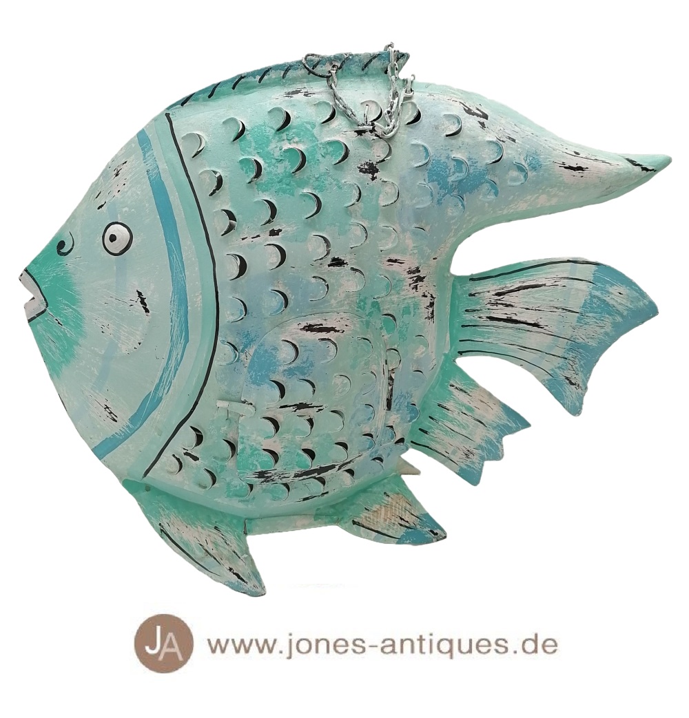handmade iron fish lantern, for outdoors (gets the classic rust look) or inside with iron chain for hanging in trees or setting up on tables. The candles light up romantically through the open "shed" and do not extinct even in windy weather.