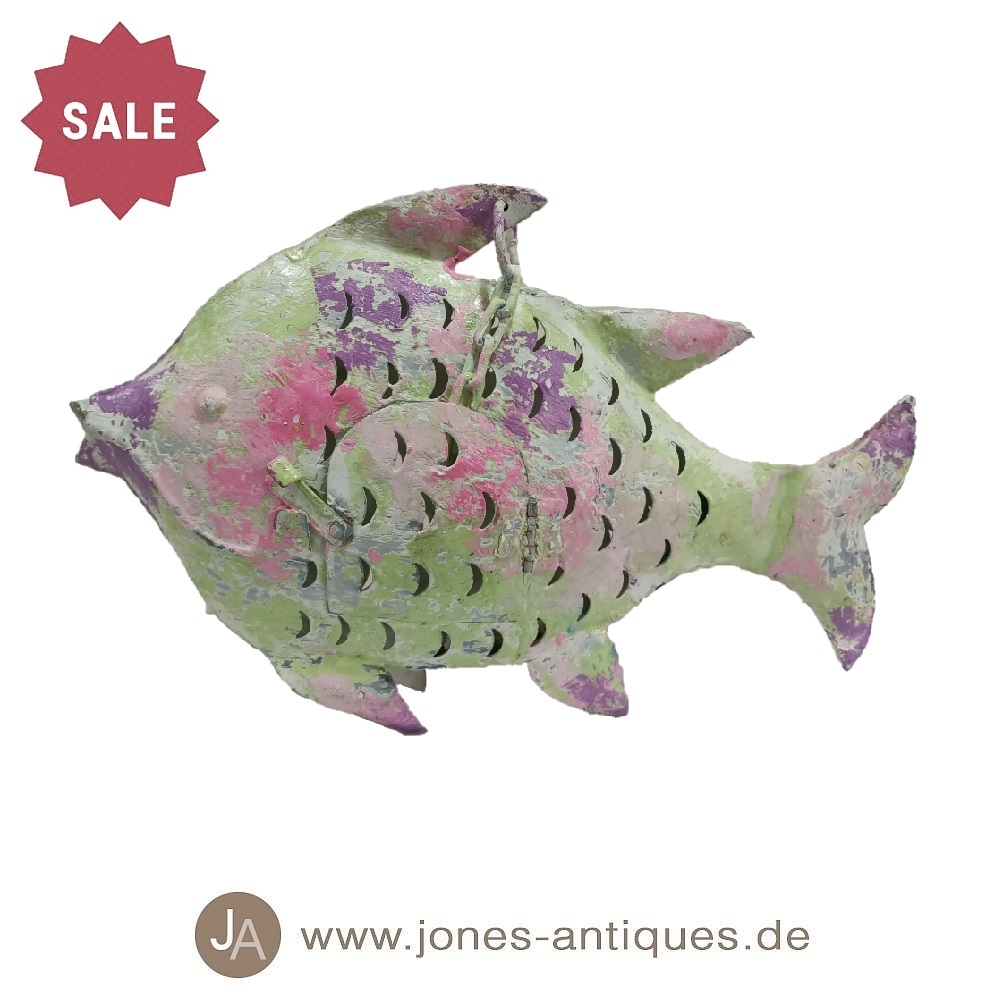 handmade ironfish wind light, for outdoors (gets the classic rust look) or inside with iron chain for hanging in trees or setting up on tables. The candles light up romantically through the open "shed" and do not go out even in windy weather.