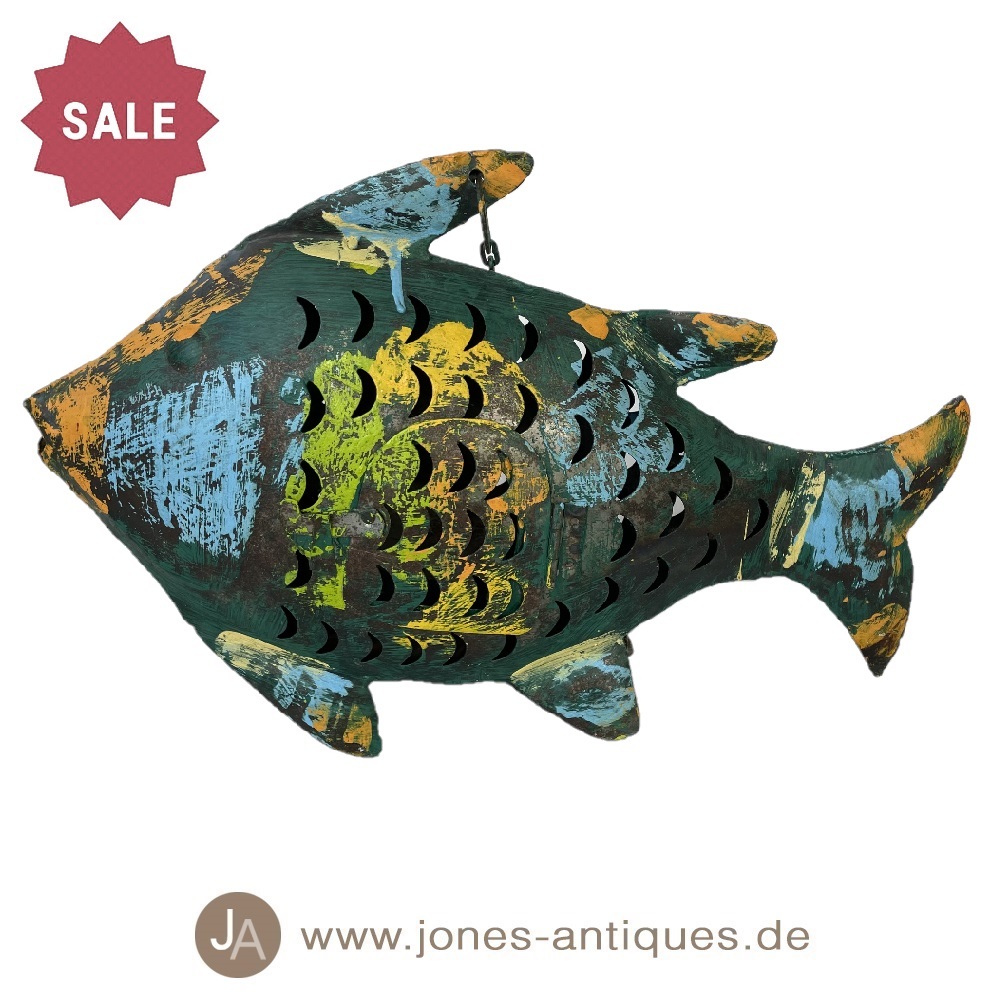 handmade ironfish wind light, for outdoors (gets the classic rust look) or inside with iron chain for hanging in trees or setting up on tables. The candles light up romantically through the open "shed" and do not go out even in windy weather.