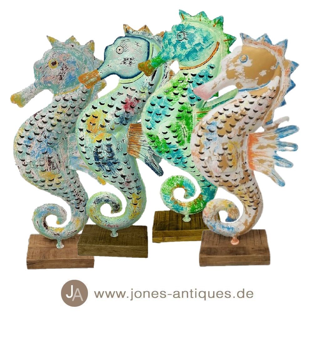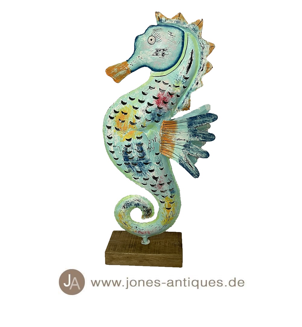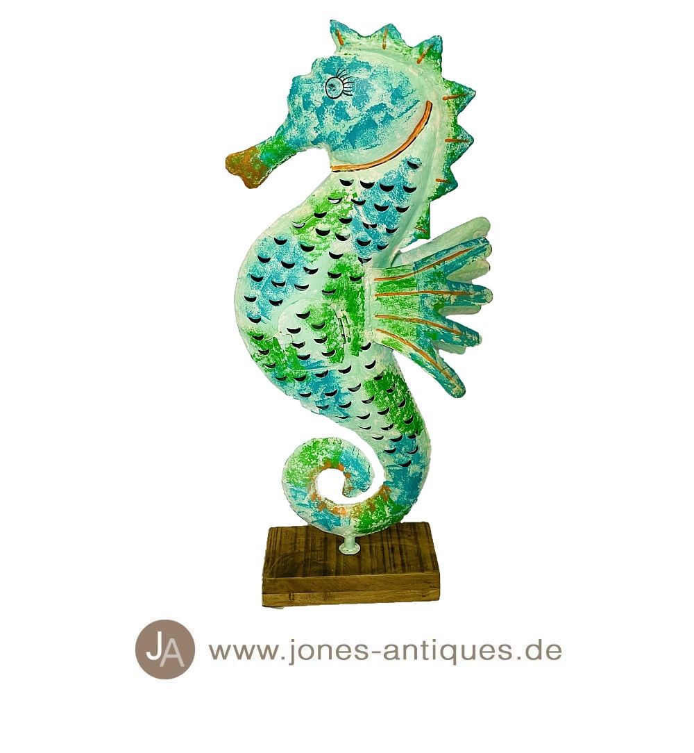 This big seahorse on a wooden base, as a lantern for outdoors (receives the classic rust look) or indoors. The light shines romantically through the open perforation and does not go out even in the wind.